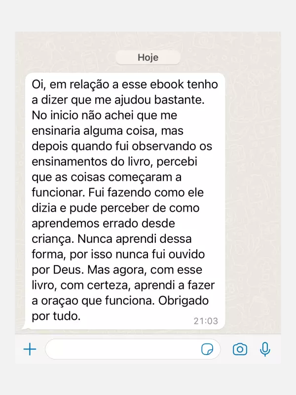 Você receberá um e-book completo contendo todos os pilares para construir a sua oração única e magnética que ensinará você a ser atendido por Deus e pelo Universo. Além de ter acesso aos ensinamentos bíblicos secretos e ocultos que NUNCA foram revelados em lugar algum.
